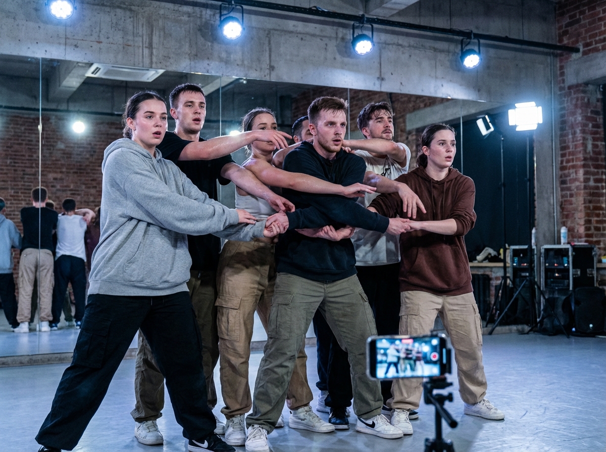 The spiral sequence in the intro. The arm spirals that open the choreography look fluid in the original because they are built on continuous circular momentum — the arm does not stop at the end of each circle before beginning the next. Most learners add a pause at each position, which breaks the flow. Practise the arm movement isolated, at very slow speed, focusing on continuity of motion rather than position accuracy.